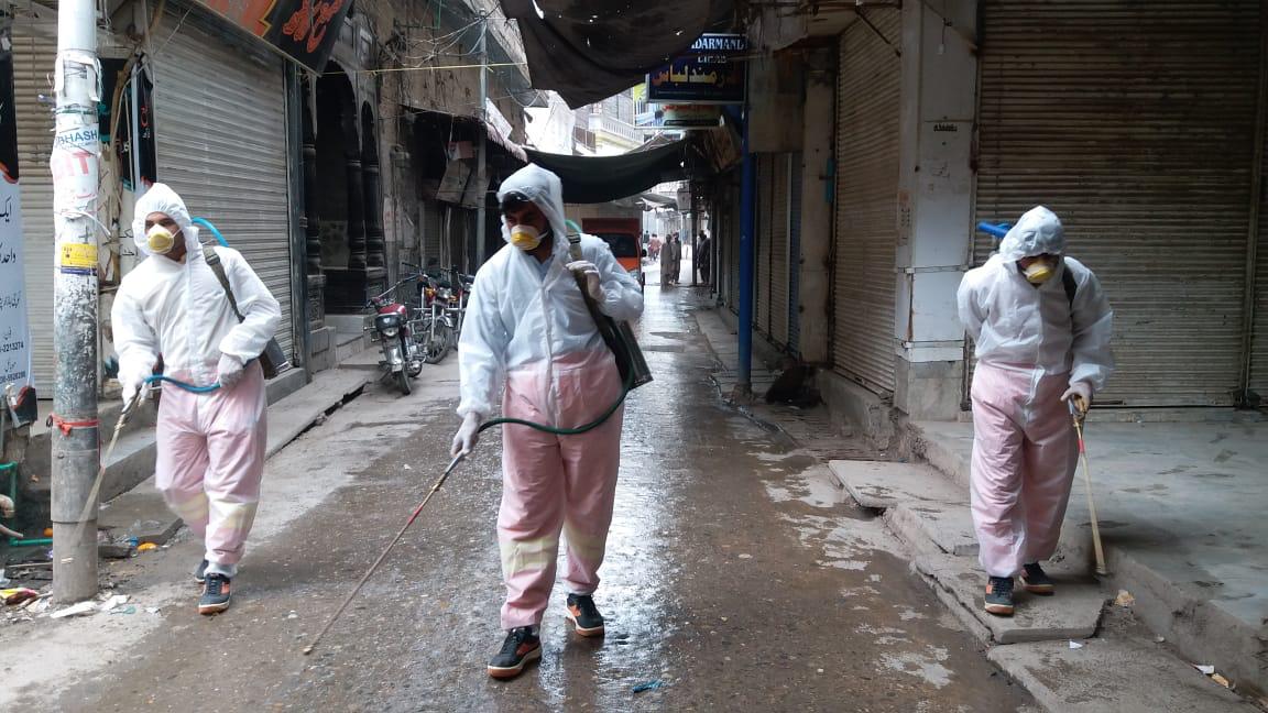 جراثیم کش اسپرے سے پشاور شہر کی گلیاں، سڑکیں، مساجد، بازار اور دفاتر دھوئی گئی ہیں۔