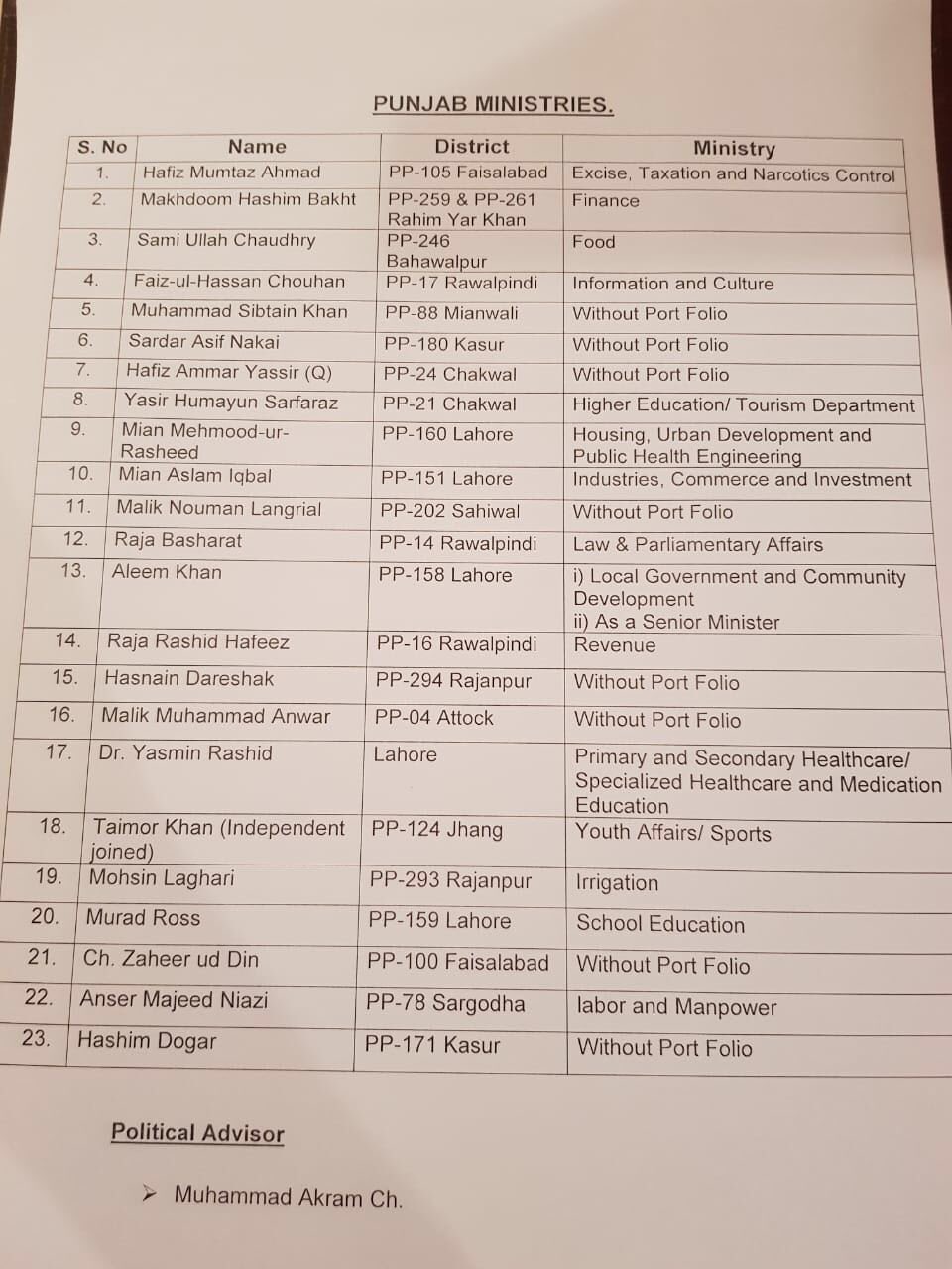 دریں اثنا حسنین دریشک، ملک نعمان لنگڑیال، محمد انور، چوہدری ظہیر الدین اور ہاشم ڈوگر کے قلمدان ابھی فائنل نہیں ہوئے جب کہ محمد اکرم چوہدری کو وزیراعلیٰ پنجاب کا سیاسی مشیر مقرر کیا گیا ہے۔
