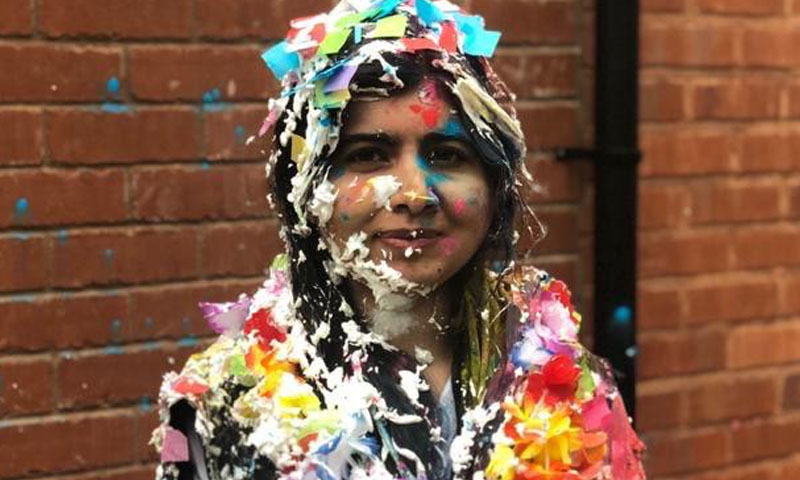 ملالہ یوسف زئی نے کپڑوں اور جسم پر لگے کیک اور رنگوں والی ٹوئٹر پر جاری کردہ تصویر لوگوں کی توجہ کا منظر بنی ہوئی ہے