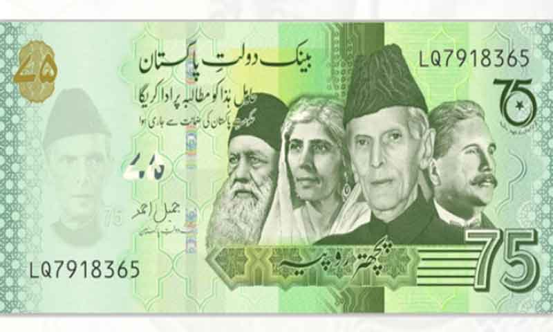 پاکستان کے 75 ویں یوم آزادی پر جاری کیے جانے والے یادگاری بینک نوٹ کے حوالے سے مختلف سوشل میڈیا پلیٹ فارمز پر گردش کرنے والے ڈیزائن جعلی ہیں۔