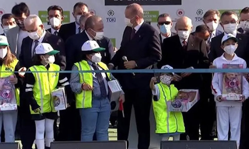 فیتہ کاٹنے کی تیاریاں ابھی جاری تھیں کہ ایک بچے نے مڑ کر طیب اردگان کی طرف دیکھا