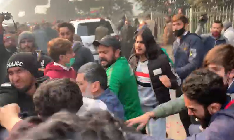 سیکیورٹی پر مامور پولیس اہلکاروں نے کارکنوں کے درمیان بیچ بچاؤ کرایا