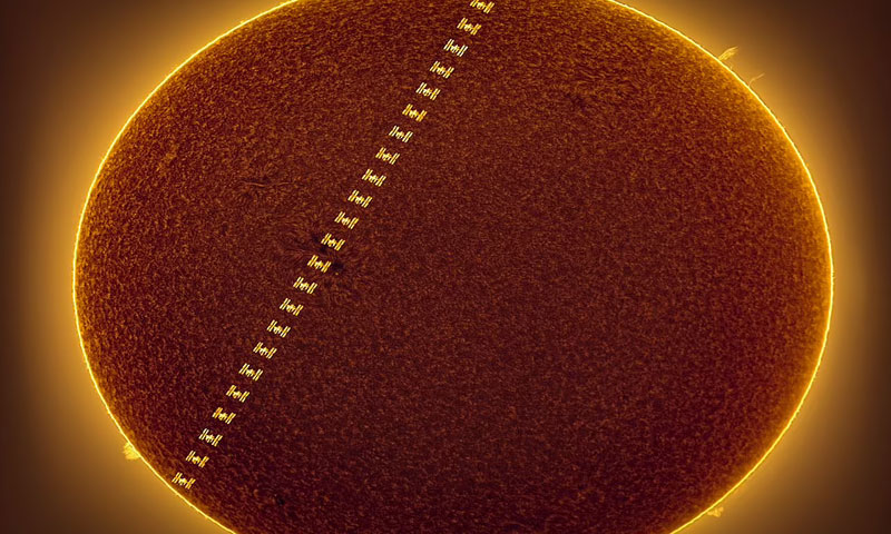 سورج کے سامنے سے گزرتی ہوئی تصاویر میں انٹرنیشنل اسپیس اسٹیشن سنہری بیلٹ کی طرح دکھائی دے رہا ہے۔