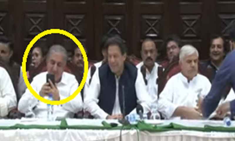 پشاور میں نوجوانوں سے خطاب کے لیے عمران خان، اسد عمر اور شاہ محمود قریشی کے ہمراہ بیٹھے ہی تھے کہ اتنے میں شاہ محمود قریشی کو کسی کا فون آ گیا۔