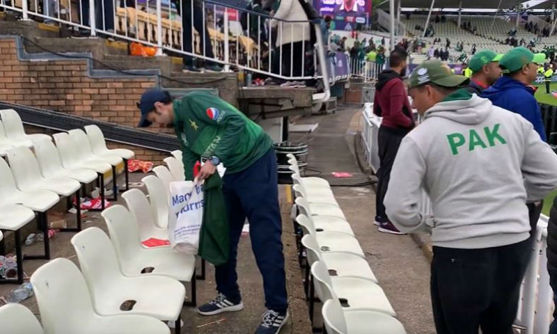 پاک نیوزی لینڈ میچ کے اختتام پر پاکستانی شائقین گراؤنڈ کے سٹینڈز کی صفائی ستھرائی کرتے ہوئے دکھائی دیئے جس کی ویڈیو بھی سوشل میڈیا پر وائرل ہو گئی