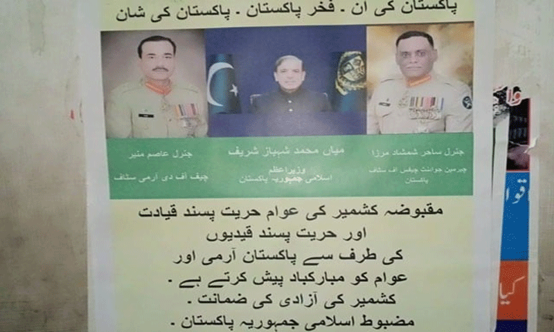 پوسٹرز پر “کشمیر بنے گا پاکستان”، “کشمیر کی آزادی کی ضمانت، مضبوط پاکستان کی ضرورت” کے نعرے درج ہیں۔