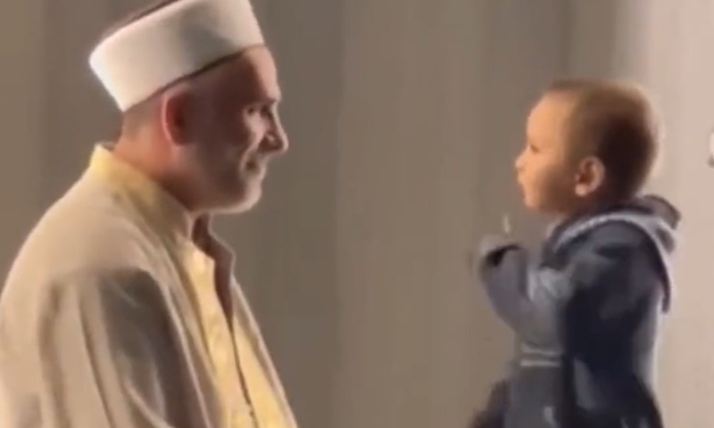 ننھا بچہ نماز کے دوران امام مسجد کے پاس پہنچ گیا
