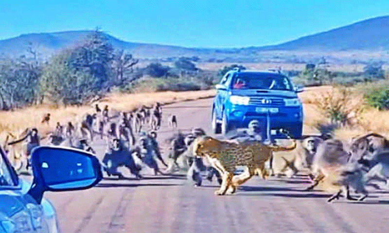 تیندوے اور بندروں کے گروپ کے درمیان ہونے والے لڑائی کے نظارے ویڈیو میں محفوظ ہو گئے۔