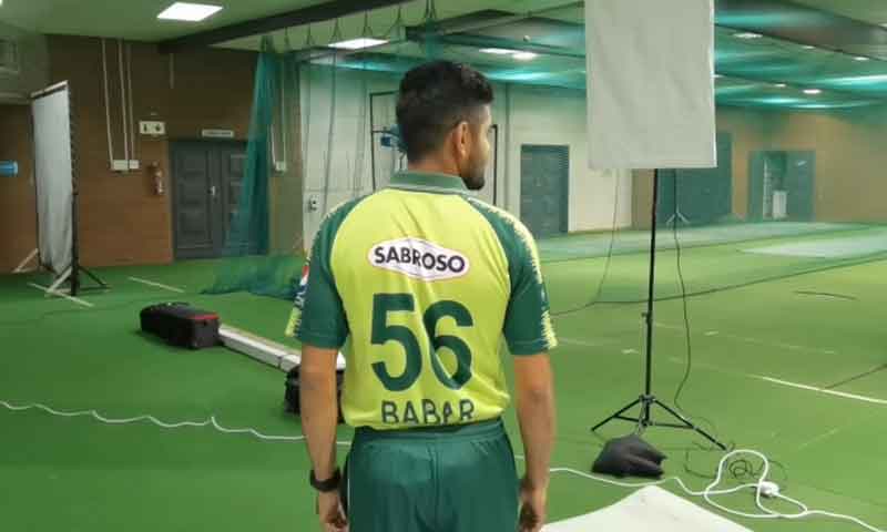 قومی ٹیم کے کپتان بابراعظم سمیت دیگر کھلاڑی مخصوص پوز بنا کر اپنی تصاویر بنوا رہے ہیں۔