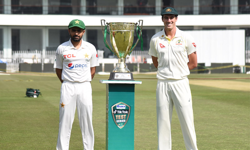 قومی کرکٹ ٹیم کے کپتان بابراعظم اورآسٹریلوی کپتان پیٹ کمنز نے ٹرافی کی رونمائی کی
