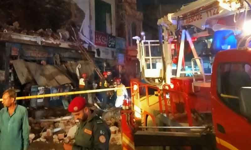 سلنڈر دھماکے کی شدت سے عمارت زمین بوس ہو گئی ہے جبکہ قریبی عمارتوں کے شیشے بھی ٹوٹ گئے۔
