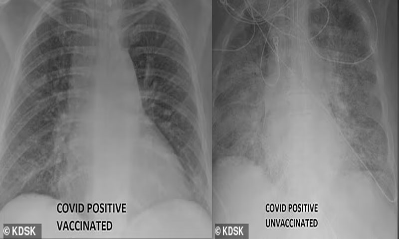 امریکی ڈاکٹر نے ویکسینیٹڈ اور ویکسین نہ لگوانے والےکورونا مریضوں کے ایکسروں کاموازنہ پیش کیا ہے۔