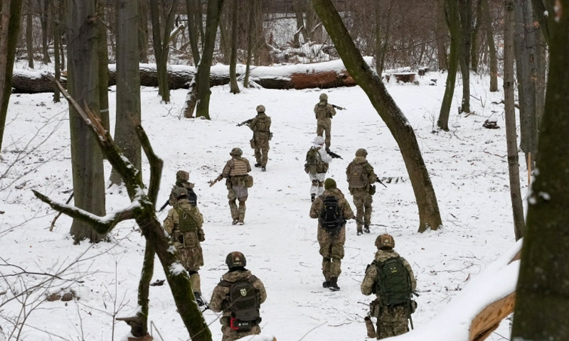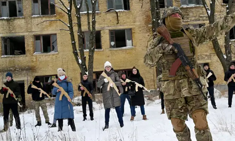یوکرین نیشنل گارڈز کے سابق اہلکار دارالحکومت کیف میں شہریوں کو لڑنے کی تربیت دے رہے ہیں
